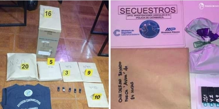 La primera medida judicial, se llevó a cabo en un inmueble ubicado en inmediaciones a la intersección de la avenida Illía y pasaje Río del Valle del Barrio Los Pinos, donde los investigadores secuestraron un dispositivo de telefonía celular marca xiaomi, de color griss; un cuaderno con varias anotaciones de interés para la causa y cuatro pendrives conteniendo información de distintas PC.