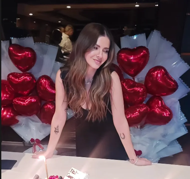 Su amigo y estilista, Juanma Cativa, publicó la primera foto de la cumpleañera en sus redes sociales, con ella en el centro posando junto a sus dos tortas y el ambiente finamente decorado con globos de corazones.