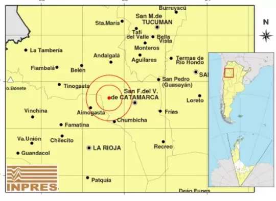 El temblor tuvo epicentro a 39 km al NE de Aimogasta; 55 km al NO de Chumbicha; 67 km al O de Catamarca -28.396 (lat) -66.455 (long).