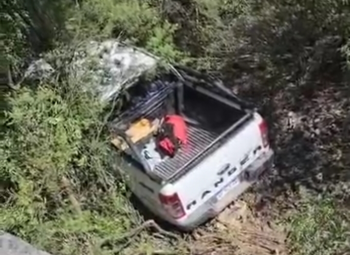 Por causas a determinar, el conductor de una camioneta Ford Ranger salió de la calzada, cayendo a un costado y terminando a metros del precipicio.