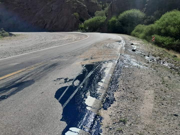 Vialidad Nacional informó que, por el derrame de alquitrán sobre calzada, se debe transitar con precaución por Ruta Nacional 40, en la Quebrada de Belén.