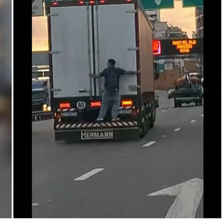 Un joven fue visto colgado de la parte trasera de un camión en la Autopista 25 de Mayo y generó temor entre los otros automovilistas, quienes algunos grabaron el insólito accionar.